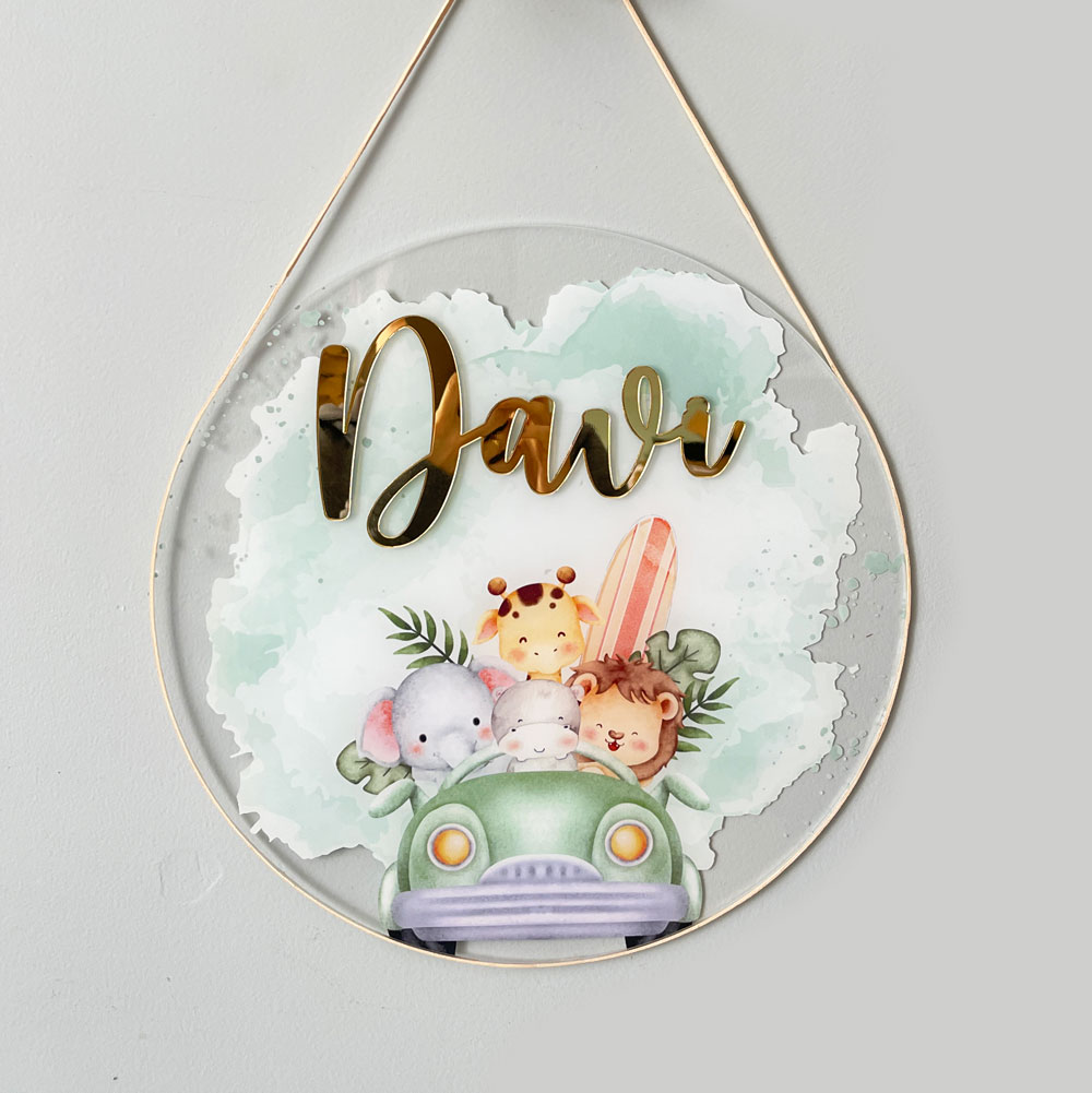 Porta Maternidade de Acrílico Aquarela Safari Carro